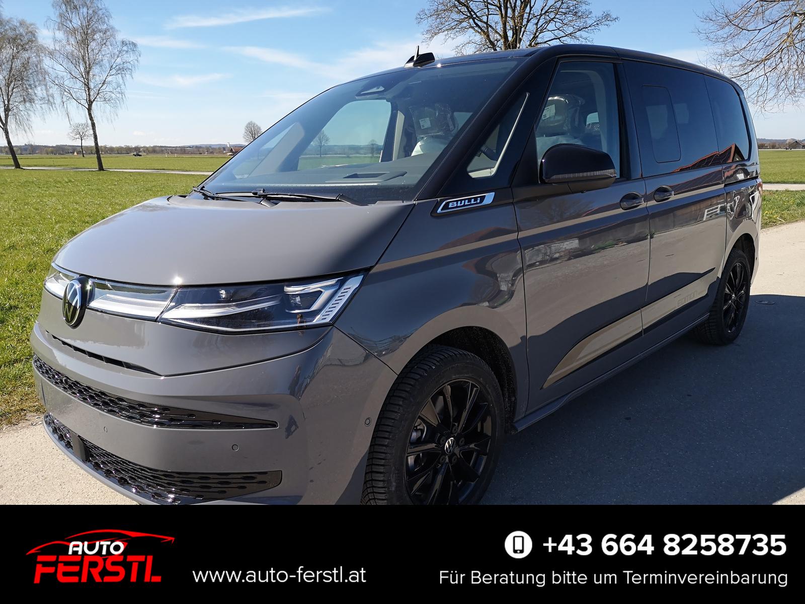 Fahrzeug 8-fach-bereift, Leichtmetallräder 7,5J x 18 (Sport Edition Design TN28, schwarz glanzgedreht) mit Sommerreifen 235 50 R18, Leichtmetallräder 7,5 J x 18 ""Toshima"" schwarz mit Winterreifen (M+S Kennung inkl. Schneeflocke / Allwetterreifen), (0NP) Bulliplakette am Kotflügel, (1U3) Bodenschienen mit Multifunktionstisch inkl. 3 Becherhalter, verschiebbar auf der vollständigen Länge des Schienensystems, (2FT) Multifunktionslederlenkrad beheizbar mit Schaltwippen, (4A3) Sitzheizung vorne, (4GX) Frontscheibe beheizbar und geräuschdämmend, (4K5) Zentralverriegelung Keyless Advance (schlüsselloses Öffnen und Starten),(6I6) Travelassistent, (6KF) Scheinwerferleiste hinterleuchtet, (7AL) Diebstahlwarnanlage, (7J2) Digital Cockpit Pro, (7UY) Radio Navigationssystem Discover Pro, (9AH) Klimaanlage ""Air Care Climatronic"", (N0K) Sitzbezug Bi-Colour Leder ""Savona"", (1D2) Anhängerkupplung schwenkbar, (Z8A) Schiebefenster im Fahrgastraum links und rechts, Fenster ab B-Säule abgedunkelt, (ZBR) 7 Sitzer: Sitzvariante 2-2-3 (Vis-a-Vis entgegen der Fahrrichtung) inkl. 4 Armlehnen, (1LB) Fahrwerk 17 Zoll, (2H5) Fahrprofilauswahl, (3FG) Panoramaglasdach, (7VL) Warmwasserstandheizung im Fahrerhaus inkl. FFB, (7W7) Proaktives Insassenschutzsystem, (9IJ) Mobiltelefon-Schnittstelle ""Comfort"" inkl. induktive Ladestation, (9VV) Soundsystem ""Harman Kardon"" inkl. 13 Lautsprecher, 840 Watt Gesamtleistung und Subwoofer, (KS1) Head Up Display, (P2G) Parkpaket Advance, Parklenkassistent inkl. ""Area View"" inkl. Rückfahrkamera, (ZED) Easy Open Paket Advanced, Umfeldbeleuchtung an der Heckklappe, Ambientebeleuchtung 30-farbig, Heckklappe sowie Schiebetüren elektrisch inkl. Easy Open/Close Funktion.